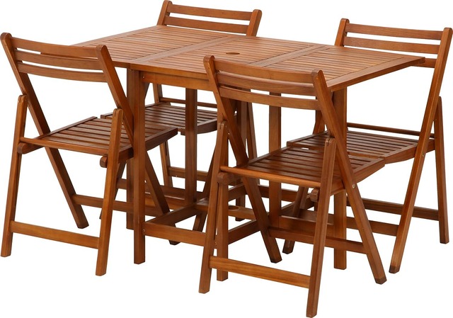 コンパクトに収納できるテーブル&チェア4脚セット 天然木の木目が温かみのある、ガーデン用のテーブル&チェアセット。 バタフライ式天板で4人用としても2人用としても使用できます。 【ご確認ください】弊社パラソルベースとは併用できない構造になっています。「よく一緒に購入されている商品」に弊社パラソルとパラソルベースが表示されている場合がございますが、こちらの商品ご購入いただいても一緒にはご使用いただけません。 サイズ:【テーブルサイズ】幅115.5×奥行75×高さ72cm【チェアサイズ】幅39×奥行38.5×高さ80cm【パラソル穴径】5cm 本体重量:テーブル13.1kg、チェア3.7kg 素材・材質:天然木(アカシア材)※オイルステイン仕上げ 耐荷重(テーブル):15kg、耐荷重(チェア):80kg