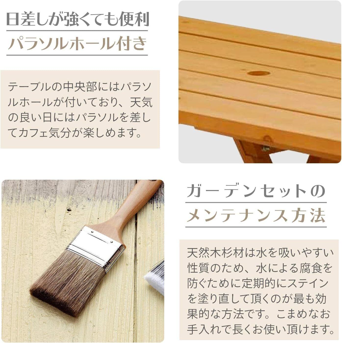 このガーデンテーブル&ベンチセットは、天然木杉材を使用し、自然な風合いが魅力的です。シンプルデザインは、様々な外観にマッチし、どんなシーンでも優雅な雰囲気を演出します。さらに、日差しが強い日でも使いやすいパラソルホールが設けられており、快適にお過ごしいただけます。