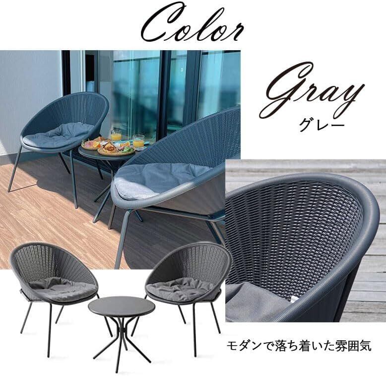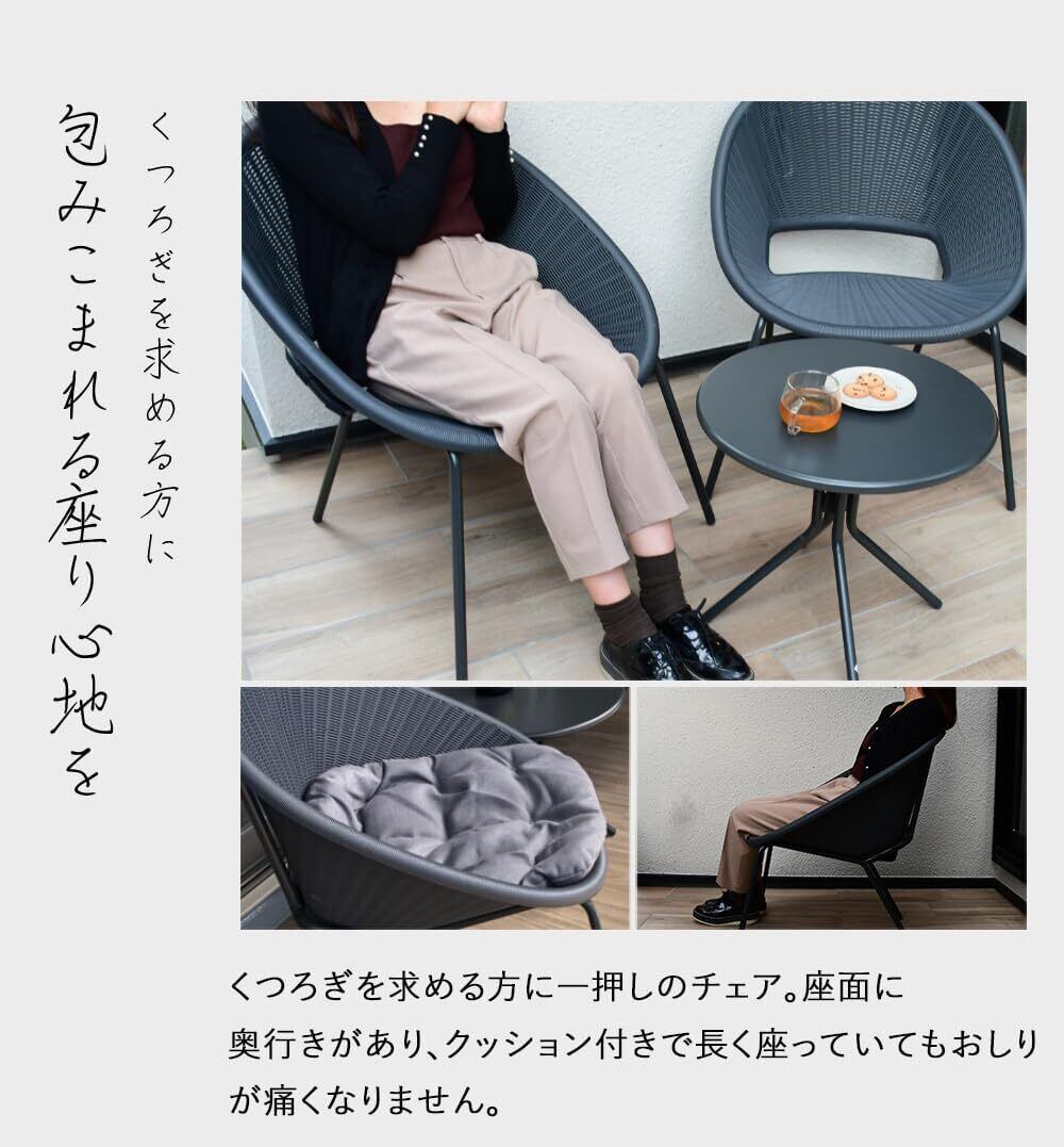 ベランダやお庭に最適!ラタン調ガーデンテーブル3点セット。 座面は樹脂製のラタン調(型押し)なので、汚れても水洗いOK! チェアはクッションを取ればスタッキング(積み重ね)可能。大きな座面が包み込まれるような座り心地で、ゆったりとくつろぎタイムをお楽しみいただけます。チェア本体とテーブルは屋外仕様のため、雨ざらしOK!屋外だけでなく、室内インテリアとしてもおすすめです。